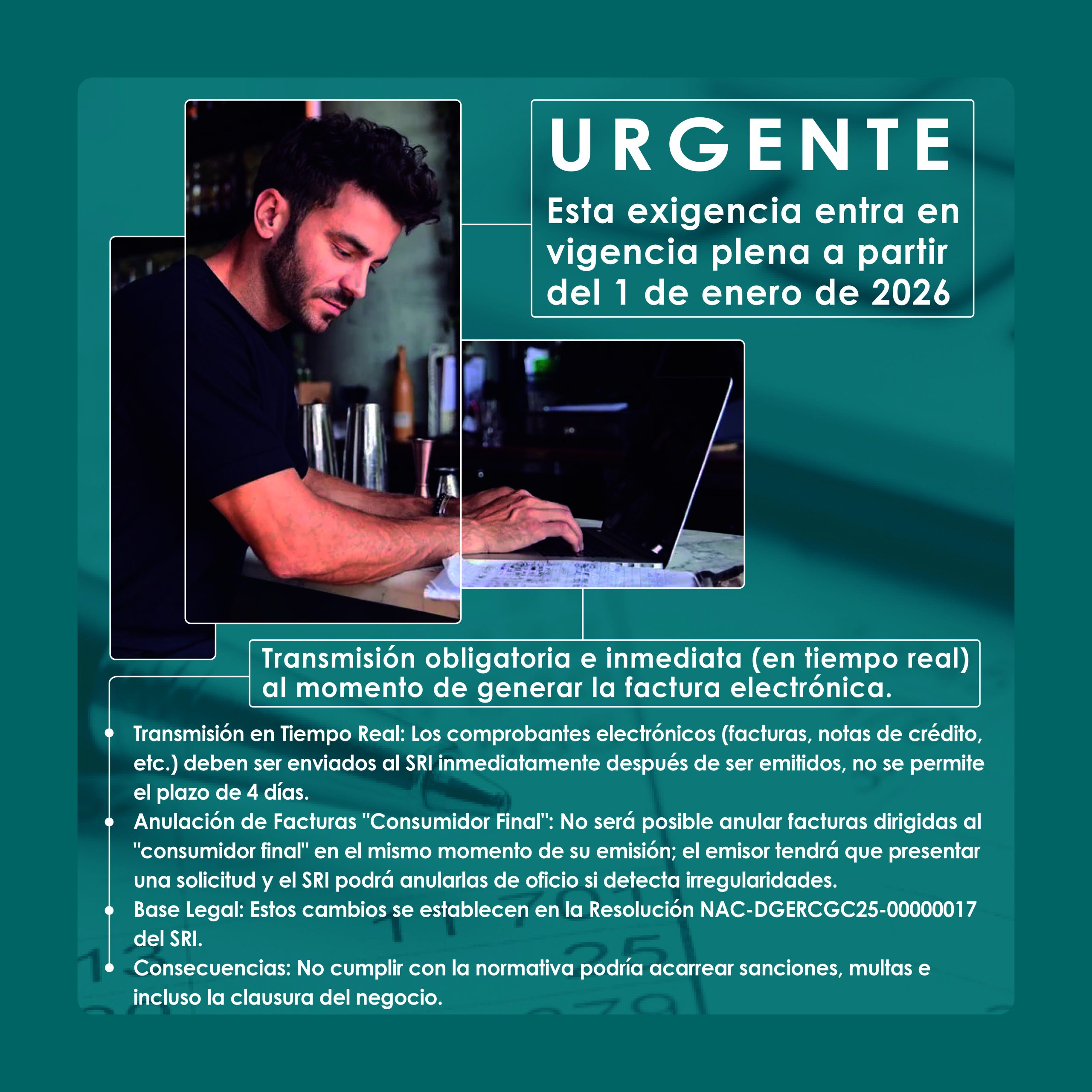 FUNCIONAMIENTO ACTUAL DEL SRI Plazo actual vigente hasta el 31 de diciembre de del 2025: La autorización de los comprobantes electrónicos puede realizarse en tiempo real o hasta 4 dias hábiles después de la emisión. Nuevo plazo que tiene vigencia desde el 1 de enero del 2026: Desde el presente año 2026 al momento de…